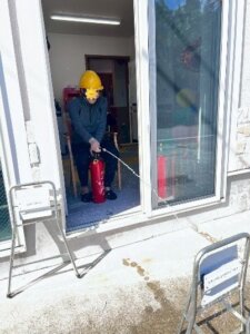 入居者様と防災訓練を行いました。皆様、真剣に水消火器を使い消火訓練を行いました。