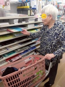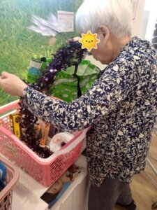ハロウィンに向けて、飾り付けのパーツを買いに出かけました☆商品をかごに入れ、袋につめました☆彡