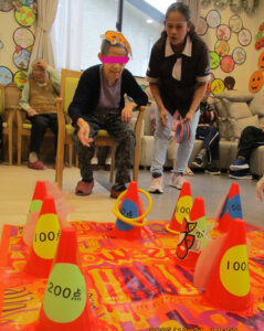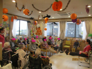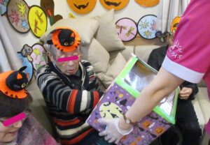 ハロウィンパーティー⇒輪投げ、チーム戦でのお玉リレー、名前ビンゴ、お菓子のつかみ取りで今年も大盛り上がりのパーティーとなりました♪