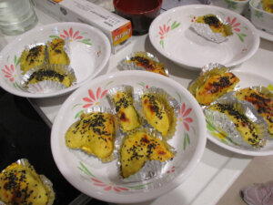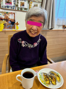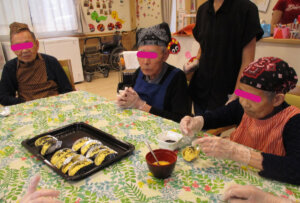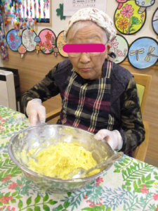 スウィートポテト作り⇒入居者様に協力頂き、極上の『スウィートポテト』が完成しました。甘い香りに入居者様も食欲が増し増しで召し上がられていました。