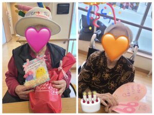お誕生日を迎えられたご利用者様のお祝い🎂です。 お2人とも、100歳目指してます! (右の方は来年100歳👍)